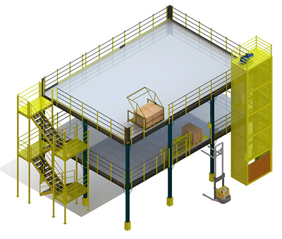 Our system design allows the use of trolleys and pallet trucks for material movement on each floor. Material flow between floors can be managed using a Vertical Reciprocating Conveyor (VRC), integrated conveyors or loading pallets on each floor using an MHE. Each floor is accessible to personnel via stairs.