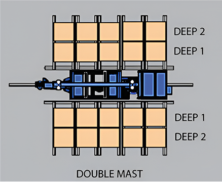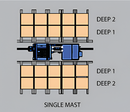 Telescopic forks can efficiently handle single or double deep racks, making them versatile for various materials and handling needs. This solution is limited to selective pallet racking, after every four deep pallet an additional aisle is required.